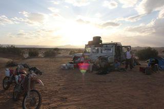 Next stop was a wild camp – in the desert. All we had was the supplies in the Land-rover to keep us going so we had to make sure we got far enough in to be able to get out to the town on the other side the next day. We picked a spot, did a quick check for snakes and scorpions and started to pitch the tents. I was pretty exhausted from the day but a few of the lads, including Mark, went to have a play in the sand dunes on their bikes. I had had my first scary dune experience earlier in the afternoon. The art with dune riding is to realise that a nice gentle run to the top of the dune often means a vertical drop on the other side. I had just managed to stop my bike before dropping 35ft over the other side of a small dune I was on. I had my helmet camera on at the time. My laughter was of the nervous kind!