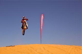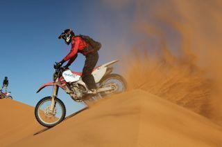 We left Zagora and within minutes we were into desert. The riding from there to here (Erg Chebbi) has been fast and dusty. The trails became less rocky and more sandy and it wasn’t long before we were riding in classic desert terrain – basically sand. This is tough going but everyone was having a great day. Early in the afternoon we arrived at a huge dry lake bed. A flat smooth plain about 5km long. We did a bit of filming with Martin our cameraman sat on the roof of the land-rover as we all rode behind. This was an amazing place to ride – the bikes totally flat out over the smooth compact sand with nothing but the horizon to worry about. It was such a blast.