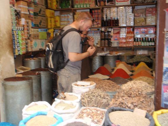 After grabbing lunch at a busy little restaurant where we ate beautiful flame grilled chicken and beef kebabs, we took a mosy back into the dark and busy shopping alleys and bought a few more bits and bobs. Martin stopped at a little spice and herb shop where the proud owner showed us his photo and feature in the Lonely Planet guide to Fez. The colours of the spices were enchanting and the smells intoxicating. We both bought some cooking spices. (I cooked chicken using mine last night, mixed with a little white wine, olive oil, onion and garlic. It was delicious).