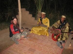 The night of the rally day in Zagora, our host at the camp site, Ibrihim, prepared us a lovely evening meal of couscous and lamb tangine. We ordered a few beers and bottles of wine and eat next to our tents and bikes on a palm and cane covered terrace. We were treated to entertainment from a local traditional Moroccan band.