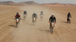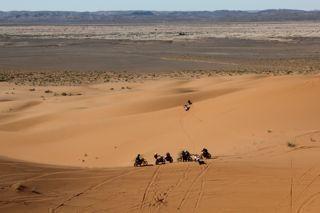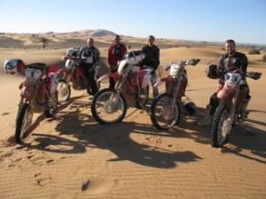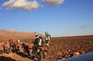 We left Zagora and within minutes we were into desert. The riding from there to here (Erg Chebbi) has been fast and dusty. The trails became less rocky and more sandy and it wasn’t long before we were riding in classic desert terrain – basically sand. This is tough going but everyone was having a great day. Early in the afternoon we arrived at a huge dry lake bed. A flat smooth plain about 5km long. We did a bit of filming with Martin our cameraman sat on the roof of the land-rover as we all rode behind. This was an amazing place to ride – the bikes totally flat out over the smooth compact sand with nothing but the horizon to worry about. It was such a blast.