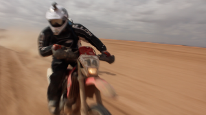 Next stop was a wild camp – in the desert. All we had was the supplies in the Land-rover to keep us going so we had to make sure we got far enough in to be able to get out to the town on the other side the next day. We picked a spot, did a quick check for snakes and scorpions and started to pitch the tents. I was pretty exhausted from the day but a few of the lads, including Mark, went to have a play in the sand dunes on their bikes. I had had my first scary dune experience earlier in the afternoon. The art with dune riding is to realise that a nice gentle run to the top of the dune often means a vertical drop on the other side. I had just managed to stop my bike before dropping 35ft over the other side of a small dune I was on. I had my helmet camera on at the time. My laughter was of the nervous kind!