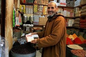 After grabbing lunch at a busy little restaurant where we ate beautiful flame grilled chicken and beef kebabs, we took a mosy back into the dark and busy shopping alleys and bought a few more bits and bobs. Martin stopped at a little spice and herb shop where the proud owner showed us his photo and feature in the Lonely Planet guide to Fez. The colours of the spices were enchanting and the smells intoxicating. We both bought some cooking spices. (I cooked chicken using mine last night, mixed with a little white wine, olive oil, onion and garlic. It was delicious).