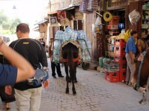 Martin and I spent a few hours wandering around and I thoroughly soaked up all the sights, sounds and smells. At one point we wondered off the main ‘street’ down a very narrow side alley, having to squeeze past the numerous donkeys (no cars allowed – all deliveries are by donkey and mule). The street got narrower and narrower to the point where I could touch the buildings either side of me without having to stretch. There was a local old lady in front who occasionally glanced over her shoulder at us and appeared to be getting a little concerned that we were following her. Eventually she said something in Arabic. Martin and I smiled uncomprehendingly. A second later we realised the situation. We were at a dead end with only one door left. Her house!! We very nearly followed her through the door before realising our mistake (the dwellings, workshops and ‘showrooms’ are impossible to distinguish between from the outside). The lady laughed as we embarrassingly backed out of her doorway, apologising.
